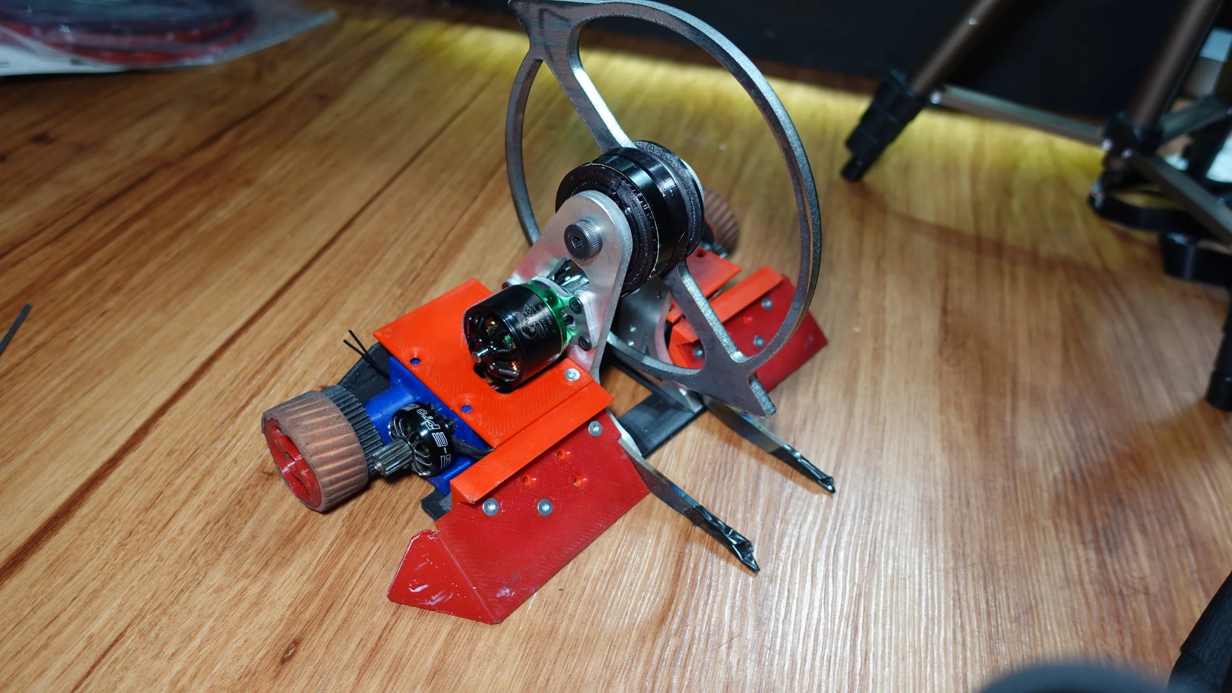 Division (3lb beetleweight) uses a lot of different materials including composite CF-Nylon drive gears, and Carbon Fiber sheet top panels and an aluminum chassis.