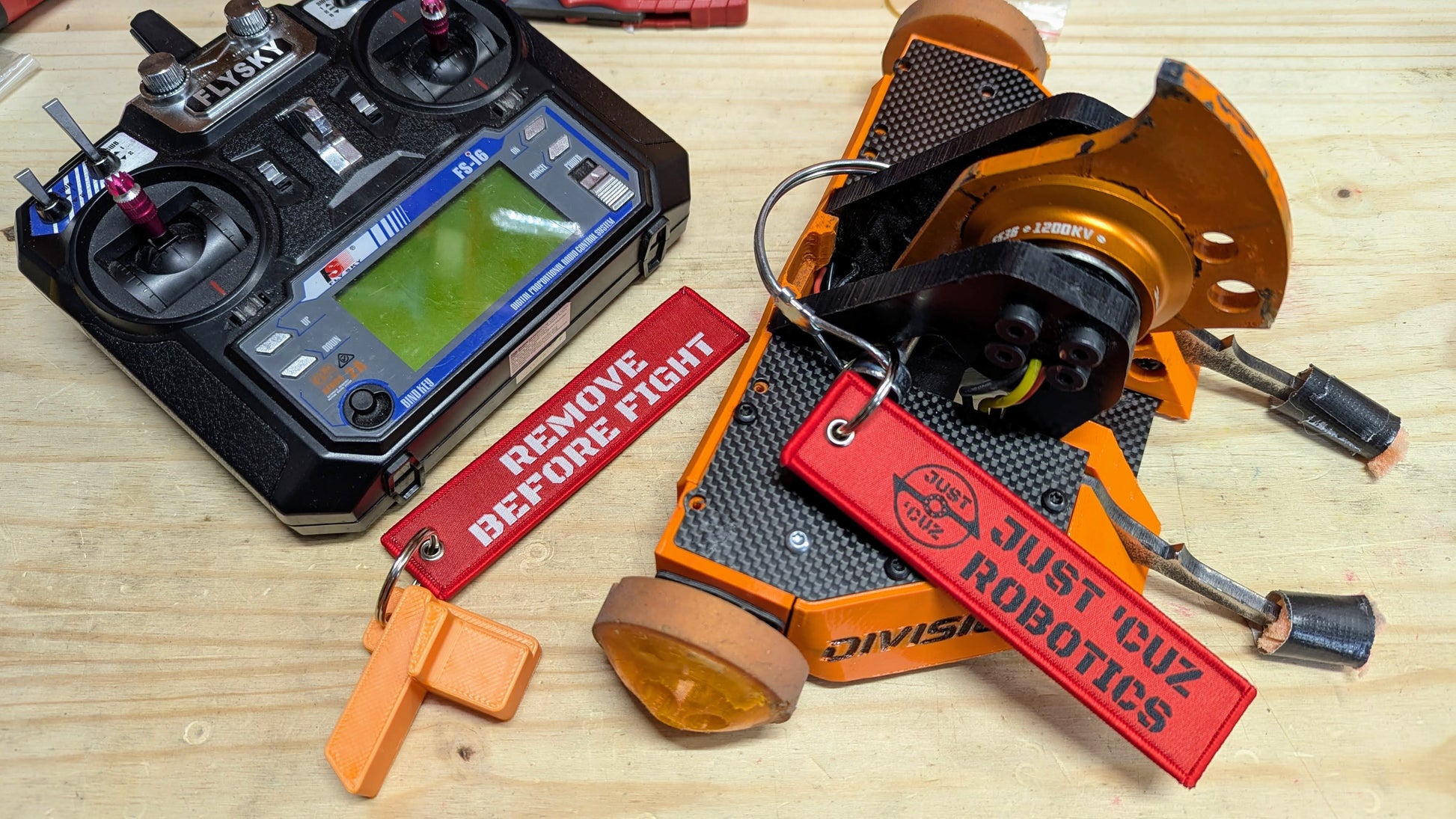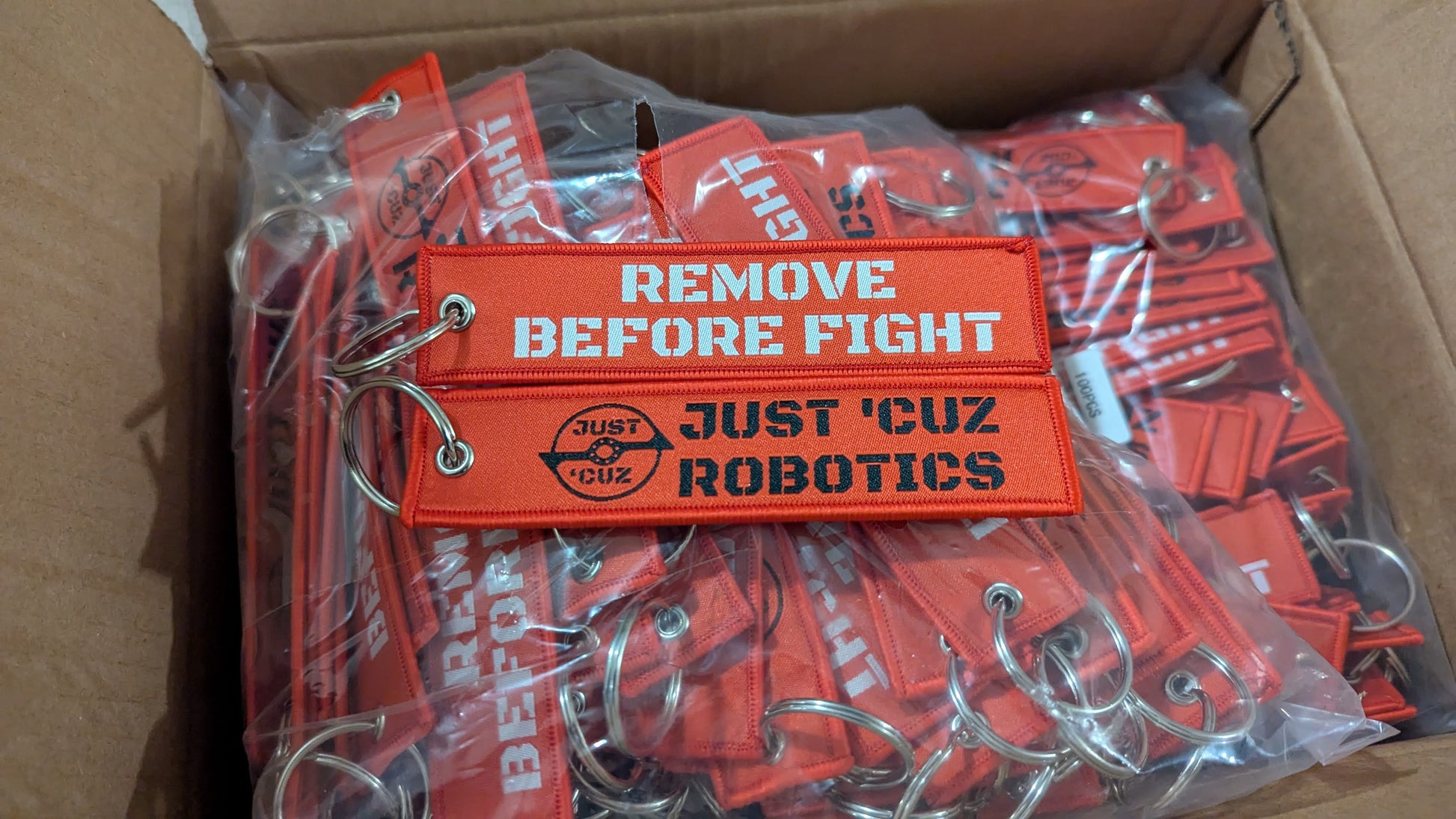 - High Contrast Text: Bold, readable text in white ("REMOVE BEFORE FIGHT") and black ("JUST 'CUZ ROBOTICS") ensures maximum visibility.